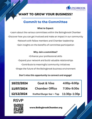 Join us for Commit to the Committee, where we’ll explore how you can make an impact in our community and what to expect when serving on a Bolingbrook Area Chamber of Commerce committee.